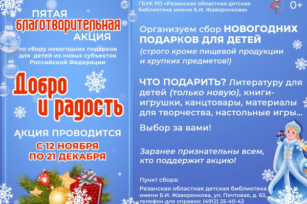 С 12 ноября по 21 декабря 2025 года Рязанская областная детская библиотека имени Б.И.Жаворонкова под девизом «Добро и радость» объявляет V благотворительную акцию по сбору новогодних подарков для детей из новых субъектов Российской Федерации.